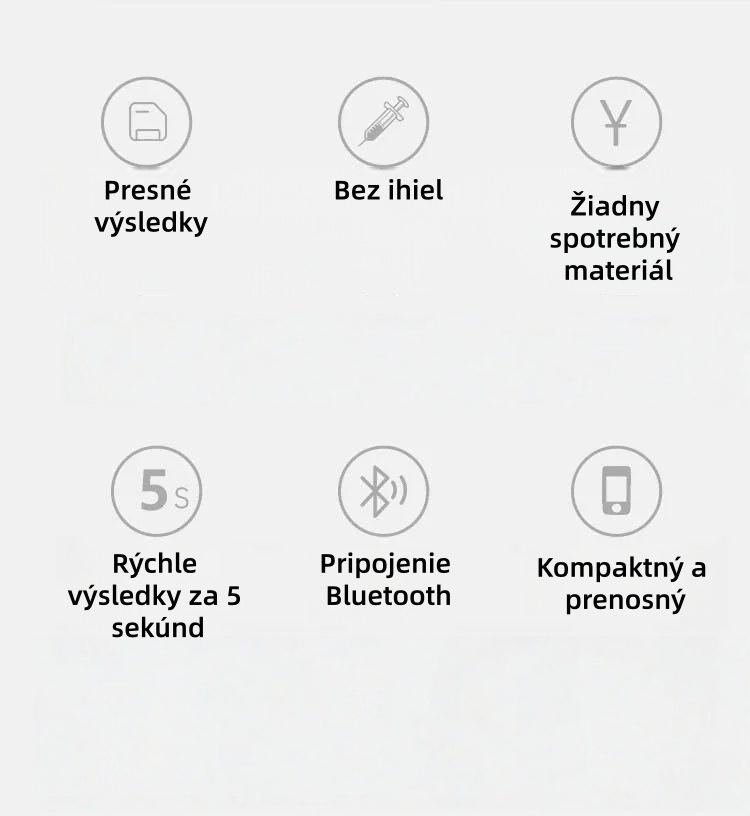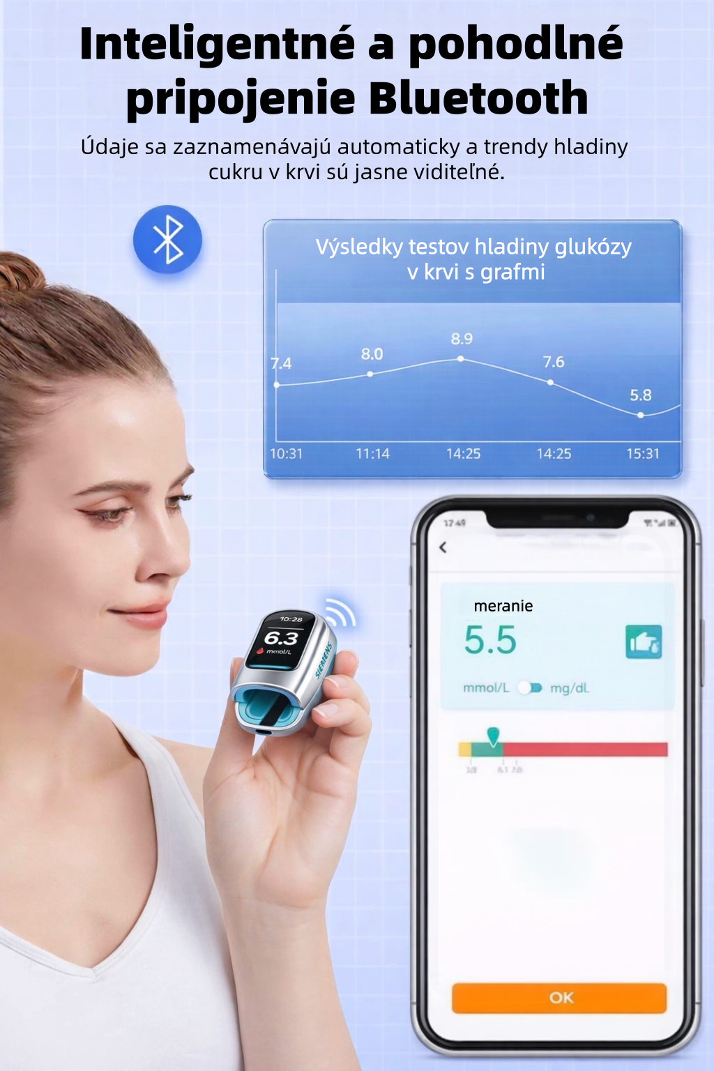 Rozlúčte sa s bolestivými pichnutiami ihlou! Koniec invazívnym a riskantným testom glukózy v krvi. Užite si bezpečné a bezbolestné meranie glukózy v krvi: žiadne pichnutie ihlou, žiadne riziko infekcie, žiadne poranenia ihlou. Rýchle. Hygienické. Spoľahlivé. Nová éra moderného testovania glukózy v krvi.