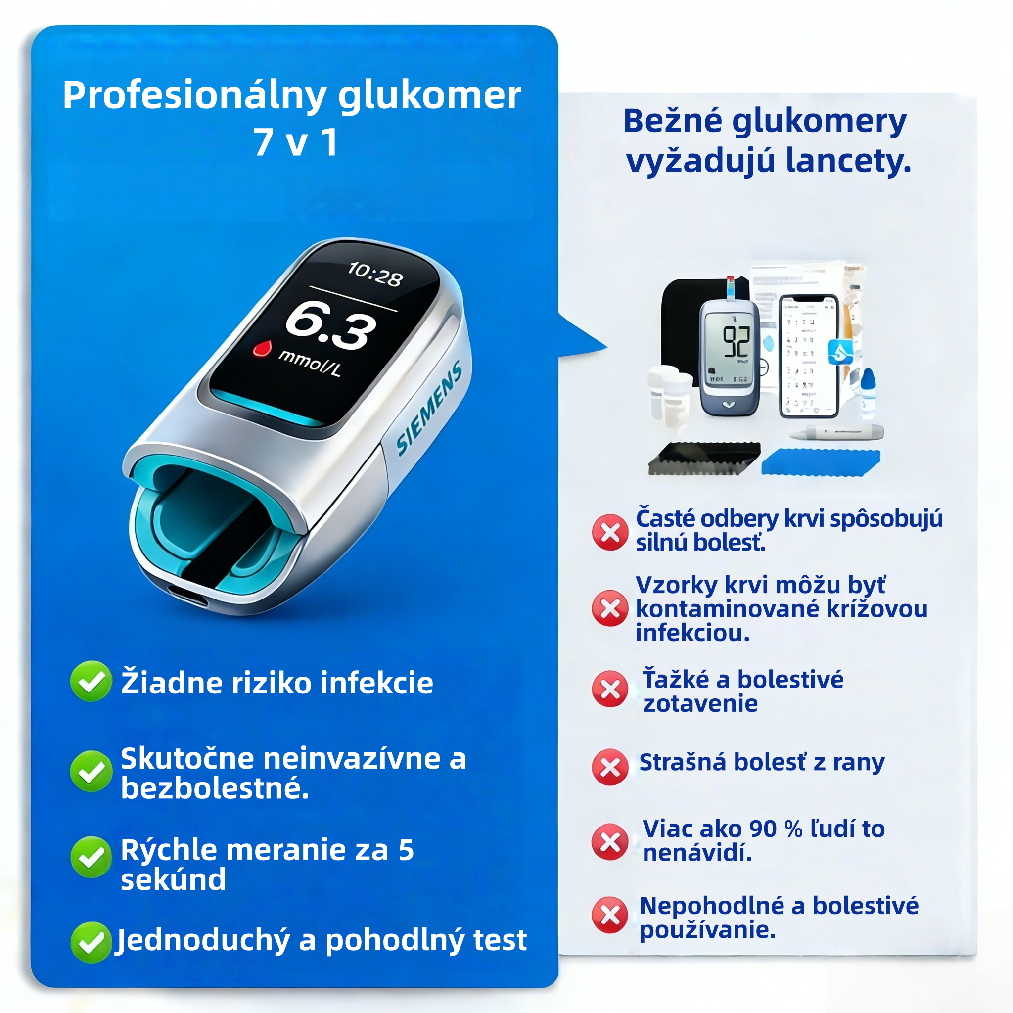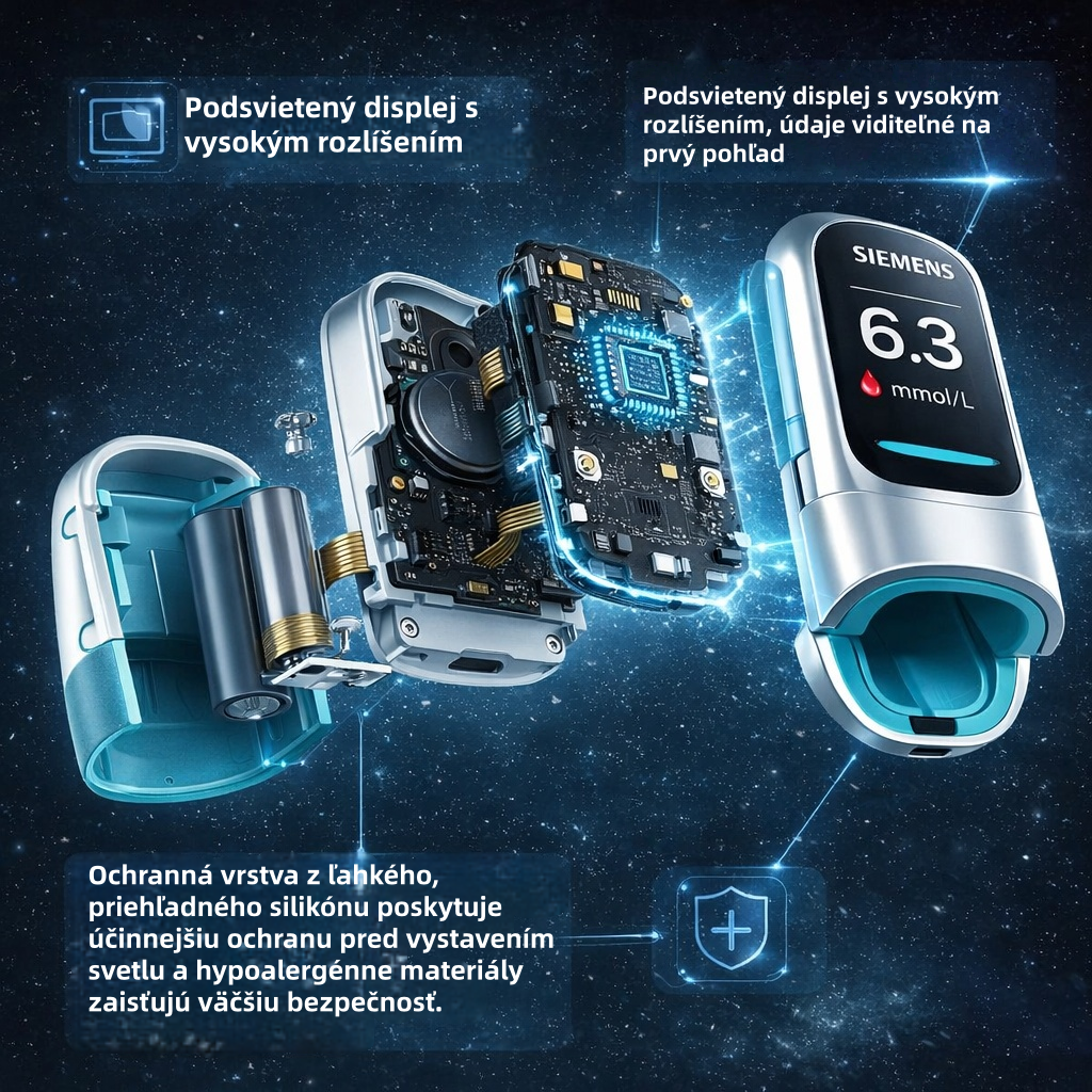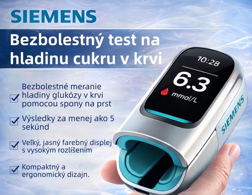 Úplne bezbolestné: jednoducho priložte ukazovák na zariadenie Siemens™ a počas 5–8 sekúnd sa zobrazí hladina glukózy v krvi, hladina kyslíka v krvi a dokonca aj tepová frekvencia. Rýchle a ľahké!